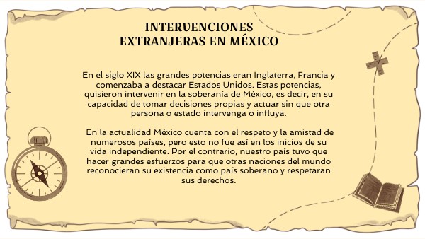 En el siglo XIX las grandes potencias eran Inglaterra, Francia y comenzaba a destacar Estados Unidos. Estas potencias, quisieron intervenir en la soberanía de México, es decir, en su capacidad de tomar decisiones propias y actuar sin que otra persona o estado intervenga o influya. En la actualidad México cuenta con el respeto y la amistad de numerosos países, pero esto no fue así en los inicios de su vida independiente. Por el contrario, nuestro país tuvo que hacer grandes esfuerzos para que otras naciones del mundo reconocieran su existencia como país soberano y respetaran sus derechos.