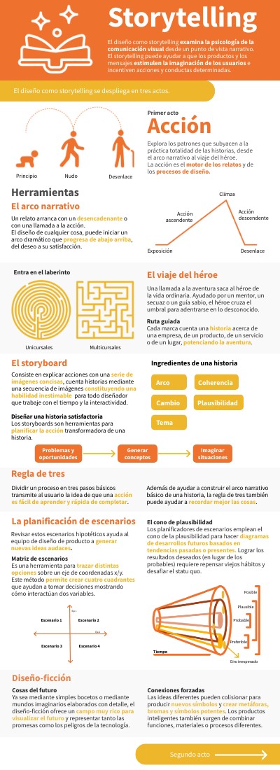 El diseño como storytelling examina la psicología de la comunicación visual desde un punto de vista narrativo. El storytelling puede ayudar a que los productos y los mensajes estimulen la imaginación de los usuarios e incentiven acciones y conductas determinadas.