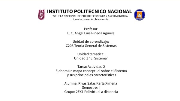 Profesor: L. C. Angel Luis Pineda Aguirre Unidad de aprendizaje: C203 Teoria General de Sistemas Unidad tematica: Unidad 1 "El Sistema" Tarea: Actividad 2Elabora un mapa conceptual sobre el Sistema y sus principales características Alumna: Rivas Salas Karla Ximena Semestre: II Grupo: 2EX1 Polivirtual a distancia
