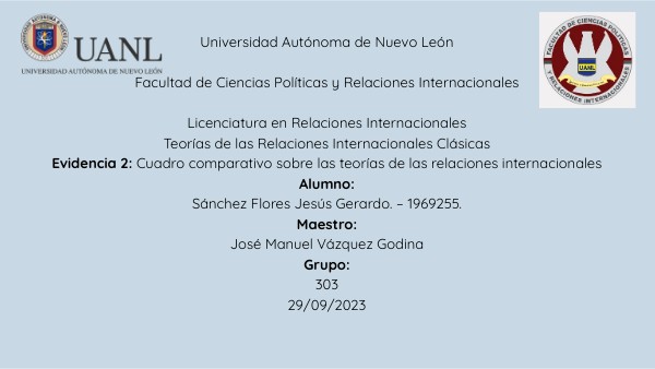 Universidad Autónoma de Nuevo León Facultad de Ciencias Políticas y Relaciones Internacionales Licenciatura en Relaciones Internacionales Teorías de las Relaciones Internacionales Clásicas Evidencia 2: Cuadro comparativo sobre las teorías de las relaciones internacionales Alumno: Sánchez Flores Jesús Gerardo. – 1969255. Maestro: José Manuel Vázquez Godina Grupo: 303 29/09/2023