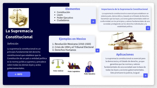 Constitución: La Constitución es el documento fundamental de un país que establece las reglas, principios y valores fundamentales que rigen la nación. Representa la máxima autoridad legal y establece la estructura del gobierno, los derechos y responsabilidades de los ciudadanos, y los límites del poder estatal. La supremacía constitucional significa que la Constitución se encuentra en la cima de la jerarquía legal y todas las leyes y actos gubernamentales deben estar en conformidad con ella. Leyes: Las leyes son normas y regulaciones establecidas por el poder Poder Ejecutivo: El Poder Ejecutivo es una de las tres ramas Ciudadanos: La ciudad Estos elementos son esenciales para comprender cómo la supremacía constitucional opera en un sistema legal.