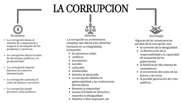 - La corrupción afecta la toma de decisiones políticas y la productividad.