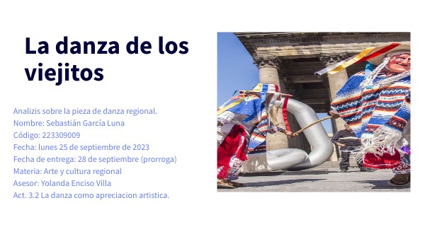 Analizis sobre la pieza de danza regional.Nombre: Sebastián García Luna Código: 223309009 Fecha: lunes 25 de septiembre de 2023 Fecha de entrega: 28 de septiembre (prorroga) Materia: Arte y cultura regional Asesor: Yolanda Enciso Villa Act. 3.2 La danza como apreciacion artistica.