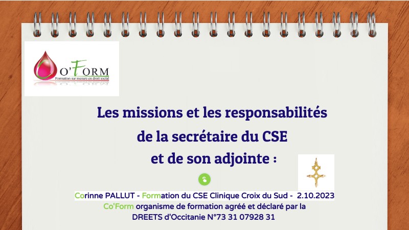 Corinne PALLUT - Formation du CSE Clinique Croix du Sud - 2.10.2023Co'Form organisme de formation agréé et déclaré par la DREETS d'Occitanie N°73 31 07928 31