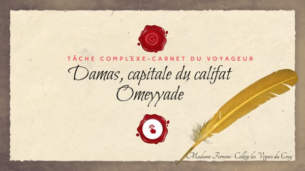 Vous êtes un groupe de voyageurs byzantins au service de l’empereur. Ce dernier souhaite mieux connaitre la civilisation omeyyade. Il vous envoie observer la ville Damas, capitale du califat Omeyyade. Après avoir compléter votre livret du voyageur, vous devez lui adresser une lettre afin de rendre compte de vos observations.