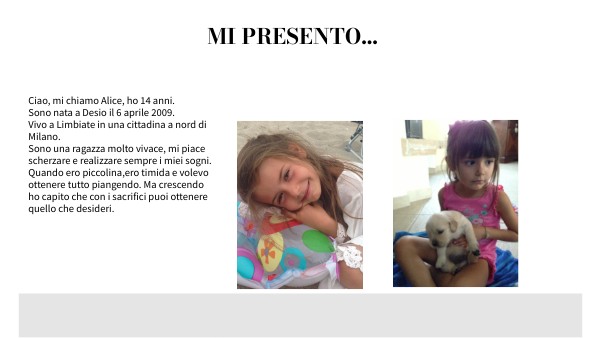 Ciao, mi chiamo Alice, ho 14 anni. Sono nata a Desio il 6 aprile 2009.Vivo a Limbiate in una cittadina a nord di Milano. Sono una ragazza molto vivace, mi piace scherzare e realizzare sempre i miei sogni. Quando ero piccolina,ero timida e volevo ottenere tutto piangendo. Ma crescendo ho capito che con i sacrifici puoi ottenere quello che desideri.