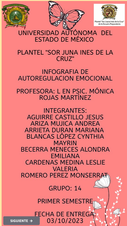 UNIVERSIDAD AUTÓNOMA DEL ESTADO DE MÉXICO PLANTEL "SOR JUanA INES DE LA CRUZ" INFOGRAFIA DE AUTOREGULACION EMOCIONAL PROFESORA: L en PSIC. MÓNICA ROJAS MARTÍNEZ INTEGRANTES: AGUIRRE CASTILLO JESUS ARIZA MUJICA ANDREA ARRIETA DURAN MARIANA blancas LÓPEZ cynthia mayrin becerra meneces alondra emiliana cardenas medina leslie valeria romero perez MONSERRAT grupo: 14 primer semestre fecha de entrega: 03/10/2023