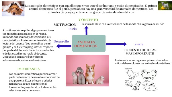 A continuación se pide al grupo mencionar los animales nombrados en la ronda, imitando sus sonidos y describiendo sus características. Posteriormente se hizo la lectura del cuento "Los animalitos de mi granja" y se hicieron preguntas al respecto por parte del docente hacía los estudiantes y de los estudiantes hacía el docente. Después se compartió un vídeo de adivinanzas de animales domésticos