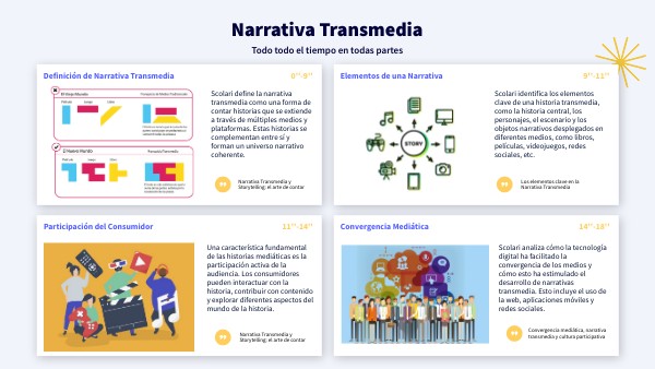 Scolari define la narrativa transmedia como una forma de contar historias que se extiende a través de múltiples medios y plataformas. Estas historias se complementan entre sí y forman un universo narrativo coherente.
