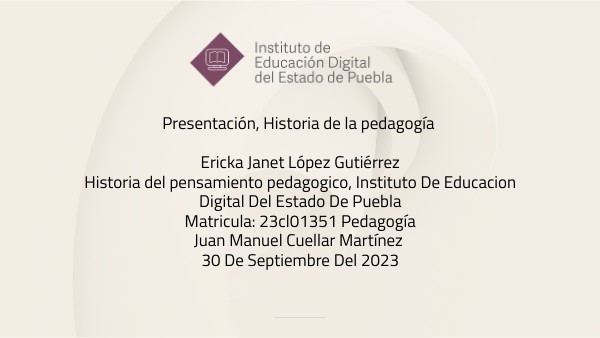 Presentación, Historia de la pedagogía Ericka Janet López Gutiérrez Historia del pensamiento pedagogico, Instituto De Educacion Digital Del Estado De Puebla Matricula: 23cl01351 Pedagogía Juan Manuel Cuellar Martínez 30 De Septiembre Del 2023