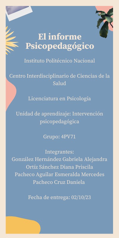 Instituto Politécnico NacionalCentro Interdisciplinario de Ciencias de la Salud Licenciatura en Psicología Unidad de aprendizaje: Intervención psicopedagógica Grupo: 4PV71 Integrantes: González Hernández Gabriela Alejandra Ortíz Sánchez Diana Priscila Pacheco Aguilar Esmeralda Mercedes Pacheco Cruz Daniela Fecha de entrega: 02/10/23