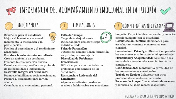 Beneficios para el estudiante: Mejora el bienestar emocional. Incrementa la motivación y la participación. Facilita el aprendizaje y el rendimiento académico. Fortalece la relación tutor-estudiante: Crea un ambiente de confianza. Fomenta la comunicación abierta. Permite una comprensión más profunda de las necesidades individuales. Desarrollo integral del estudiante: Promueve habilidades socioemocionales. Prepara al estudiante para la vida adulta. Contribuye a su crecimiento personal.