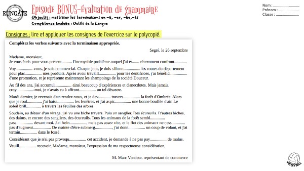 Objectif : maîtriser les terminaisons en -é, -er, -ée,-ésCompétence évaluée : Outils de la Langue