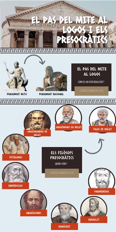 El pas del mite al logos, va tenir lloc a Grècia, localització en la qual els primers filòsofs, dels quals parlarem a continuació, van començar a posar en dubte la veracitat i coherència dels mites emprats per a donar explicacions a diversos fets.