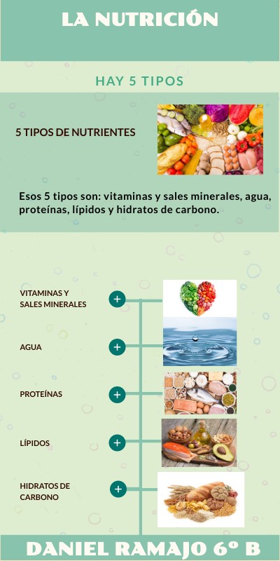 Esos 5 tipos son: vitaminas y sales minerales, agua, proteínas, lípidos y hidratos de carbono.