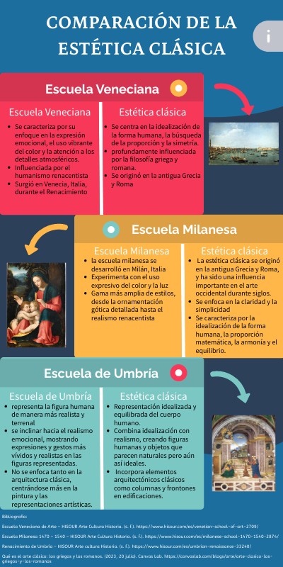 Bibliografía: Escuela Veneciana de Arte – HISOUR Arte Cultura Historia. (s. f.). https://www.hisour.com/es/venetian-school-of-art-2709/ Escuela Milanesa 1470 – 1540 – HISOUR Arte Cultura Historia. (s. f.). https://www.hisour.com/es/milanese-school-1470-1540-2874/ Renacimiento de Umbría – HISOUR Arte cultura Historia. (s. f.). https://www.hisour.com/es/umbrian-renaissance-33240/ Qué es el arte clásico: los griegos y los romanos. (2023, 20 julio). Canvas Lab. https://canvaslab.com/blogs/arte/arte-clasico-los-griegos-y-los-romanos