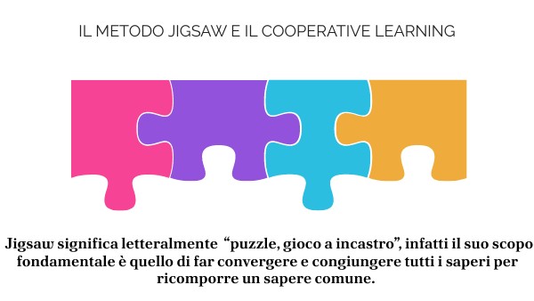 Vantaggi del metodo JigsawNel metodo Jisgsaw ogni studente si sente responsabilizzato alla partecipazione attiva e alla riuscita dell’attività didattica nel suo complesso, quindi è indotto ad agire bene sia per sé che per gli altri. Il metodo Jigsaw migliora la motivazione ad apprendere e interviene nell’ambito relazionale, cercando di risolvere i conflitti e puntando alla collaborazione tra pari. I saperi acquisiti tramite responsabilizzazione diretta e cooperazione tra pari, infine, si rivelano più solidi e duraturi.