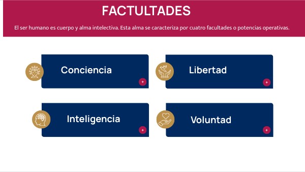 El ser humano es cuerpo y alma intelectiva. Esta alma se caracteriza por cuatro facultades o potencias operativas.