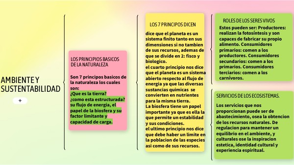 Son 7 principos basicos de la naturaleza los cuales son: ¿Que es la tierra? ¿como esta estructurada? su flujo de energia, el papel de la biosfera y su factor limitante y capacidad de carga.
