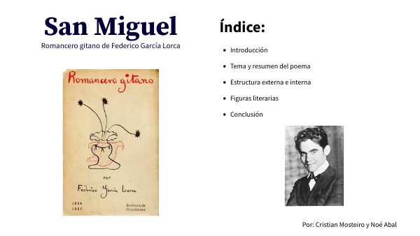 En resumen, el poema "San Miguel" de Federico García Lorca es una obra poética que captura la esencia de la cultura gitana y explora temas de pasión y belleza. A través de imágenes poéticas vívidas, Lorca es capaz de llevarnos a un mundo lírico y evocador. Este poema es un ejemplo destacado de su habilidad para crear conexiones emocionales con los lectores y reflexionar sobre cuestiones universales.
