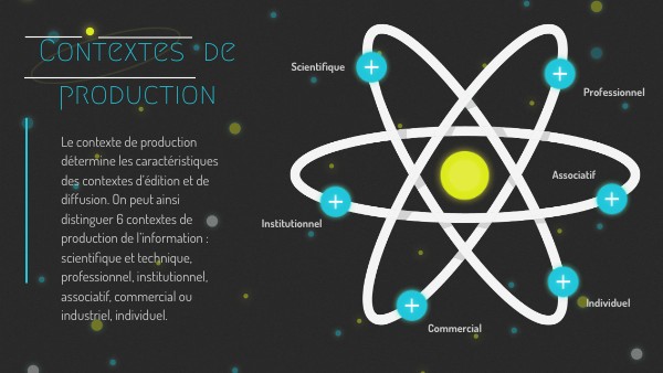 Le contexte de production détermine les caractéristiques des contextes d’édition et de diffusion. On peut ainsi distinguer 6 contextes de production de l’information : scientifique et technique, professionnel, institutionnel, associatif, commercial ou industriel, individuel.