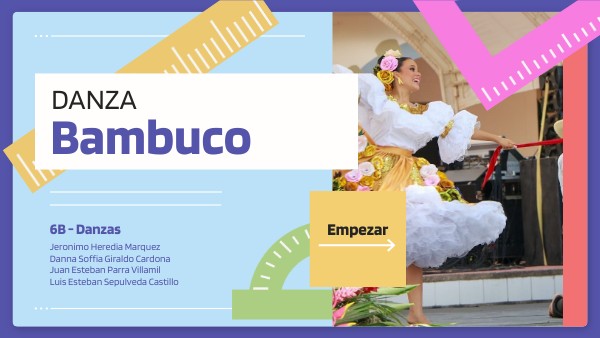 El bambuco es un baile de la region Andina de Colombia, es simbolo de la identidad cultural colombiana y un baile indispensable en los festivales. Es parte del folclor del pais y se caracteriza por la vestimenta, los pasos elegantes, etc. Bambuco proviene de la palabra ¨Wampu puku¨ que significa Vasija en forma de canoa y con el pasar del tiempo fue cambiando la palabra hasta llegar a bambuco.