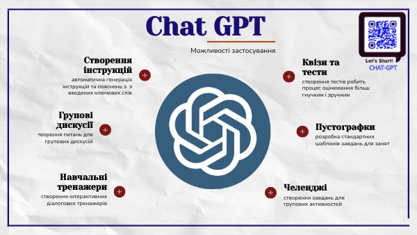 Chat GPT може допомогти створити цікаві та роздумливі питання для обговорення на заняттях або в групових дискусіях. Ви можете ввести тему і отримати список запитань, які стимулюють обговорення та розвиток критичного мислення.