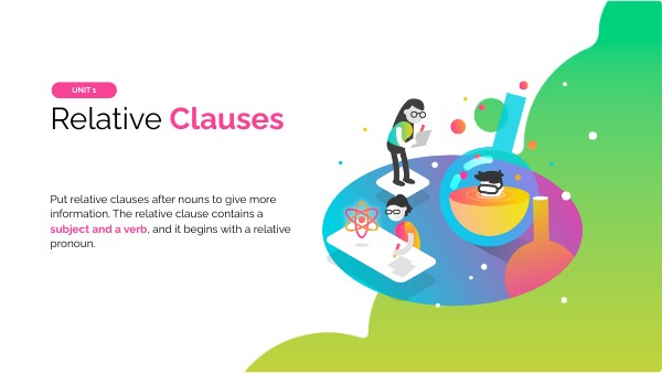 Put relative clauses after nouns to give more information. The relative clause contains a subject and a verb, and it begins with a relative pronoun.