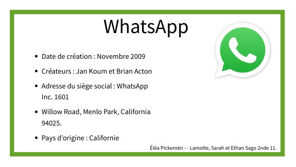 - Adresse du siège social : WhatsApp Inc. 1601