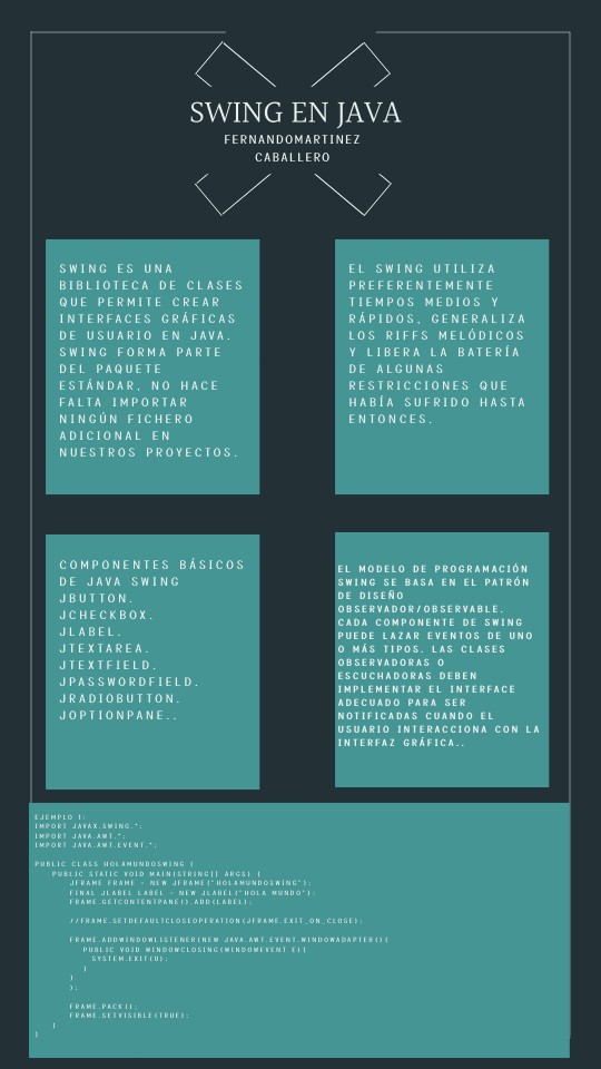 Swing es una biblioteca de clases que permite crear interfaces gráficas de usuario en Java. Swing forma parte del paquete estándar, no hace falta importar ningún fichero adicional en nuestros proyectos.
