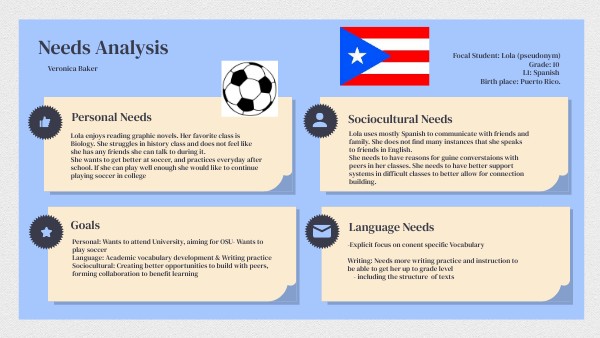 Personal: Wants to attend University, aiming for OSU- Wants to play soccer Language: Academic vocabulary development & Writing practice Sociocultural: Creating better opportunities to build with peers, forming collaboration to benefit learning