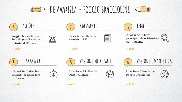 Nell’estratto del dialogo De avaritia, composto nel 1429, Poggio Bracciolini introduce, attraverso la conversazione di quattro personaggi, il tema dell'avarizia, ovvero del desiderio smodato di possedere ricchezze, affermando che tutti i desideri, essendo naturali, devono essere valorizzati e considerati positivi e benevoli. Bracciolini considera il desiderio di arricchirsi necessario e lo rende quasi un valore. Esso è motore della vita lavorativa e sociale e individuale e importante mezzo per lo splendore cittadino.