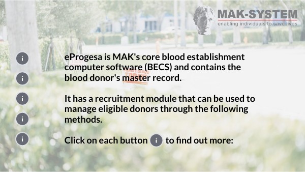 eProgesa is MAK's core blood establishment computer software (BECS) and contains the blood donor's master record. It has a recruitment module that can be used to manage eligible donors through the following methods. Click on each button to find out more: