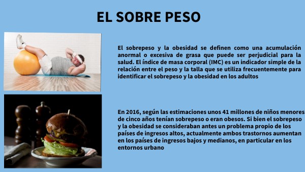 El sobrepeso y la obesidad se definen como una acumulación anormal o excesiva de grasa que puede ser perjudicial para la salud. El índice de masa corporal (IMC) es un indicador simple de la relación entre el peso y la talla que se utiliza frecuentemente para identificar el sobrepeso y la obesidad en los adultos