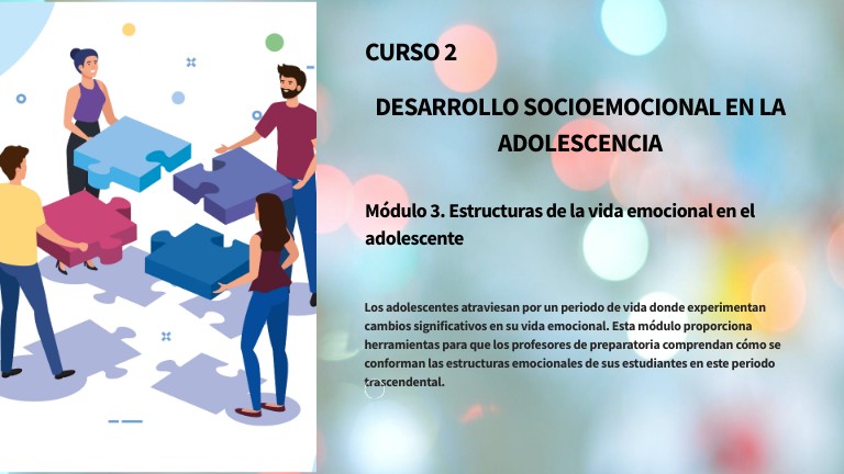 Los adolescentes atraviesan por un periodo de vida donde experimentan cambios significativos en su vida emocional. Esta módulo proporciona herramientas para que los profesores de preparatoria comprendan cómo se conforman las estructuras emocionales de sus estudiantes en este periodo trascendental.