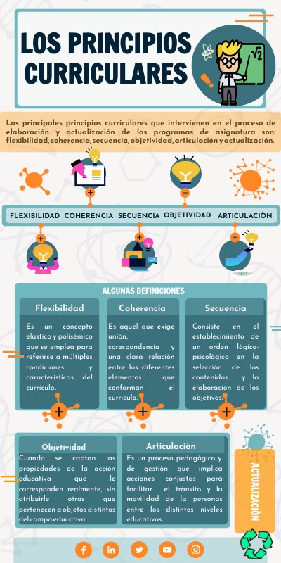 Los principales principios curriculares que intervienen en el proceso de elaboración y actualización de los programas de asignatura son: flexibilidad, coherencia, secuencia, objetividad, articulación y actualización.