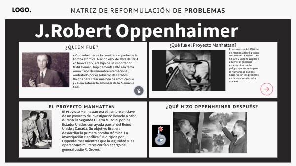 Los Álamos Foto de Oppenheimer para el servicio de seguridad del Laboratorio Nacional de Los Álamos. Cuando empezó la Segunda Guerra Mundial, Oppenheimer se involucró fuertemente en los esfuerzos para desarrollar una bomba atómica que ya ocupaba mucho del tiempo y equipamiento del Laboratorio de Radiación de Ernest Lawrence, en Berkeley. En 1941, Lawrence, Vannevar Bush, Arthur Compton y James Conant intentaban que el Comité Uranio, establecido por el presidente Franklin Delano Roosevelt en 1939, les asignara el proyecto de la bomba, porque opinaban que avanzaba con demasiada lentitud. Invitaron a Oppenheimer para que asumiera el trabajo de cálculo sobre los neutrones, tarea a la que se enfrentó con pleno vigor, renunciando a lo que llamó sus «vagabundeos izquierdistas» para dedicarse a los que ahora consideraba su deber (aunque aún tenía muchos amigos y estudiantes muy radicales). Cuando el ejército de EE. UU. recibió la jurisdicción sobre el esfuerzo de la bomba, ahora bautizado Proyecto Manhattan, el director del proyecto Leslie R.