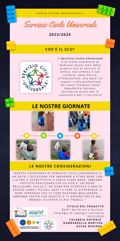 "QUESTA ESPERIENZA DI SERVIZIO CIVILE UNIVERSALE CI HA DATO L'OCCASIONE PER IMPARARE A STARE BENE CON L'ALTRO E SOPRATTUTTO A FARLO STARE BENE. ABBIAMO POPTUTO REALIZZARE CHE LA VITA E' UN DONO BELLISSIMO, NULLA E' DA DARE PER SCONTATO E MOLTO SPESSO SONO I PICCOLI GESTI A FARE LA DIFFERENZA, A DARE SPERANZA CHE LE COSE POSSANO MIGLIORARE. ABBIAMO CAPITO CHE QUESTO E' IL NOSTRO POSTO NEL MONDO: ACCANTO AI PIU' FRAGILI." TITOLO DEL PROGETTO DaFF: Da Ferite a Feritoie. Strategie di coping e resilienza 2023/2024 CALABRIA ANTONIA GAMBARDELLA MARTINA GUIDA MIRIANA