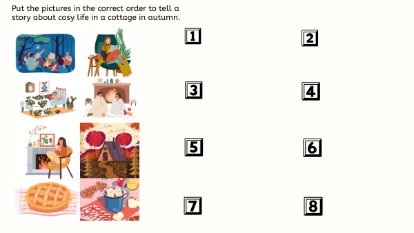 Put the pictures in the correct order to tell a story about cosy life in a cottage in autumn.