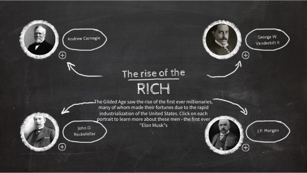 The Gilded Age saw the rise of the first ever millionaries, many of whom made their fortunes due to the rapid industrialization of the United States. Click on each portrait to learn more about these men - the first ever "Elon Musk"s