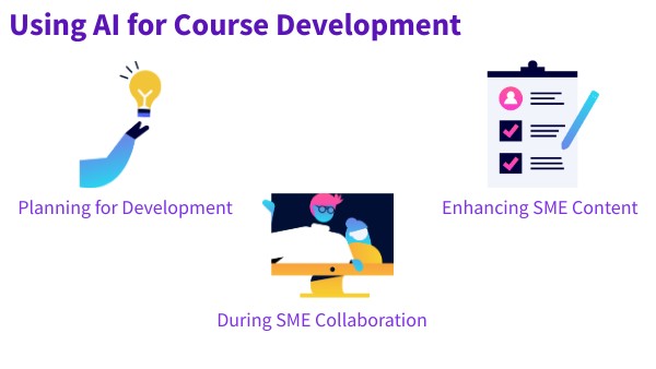 REMEMBER THESE ARE INTROS Video 1 - Using AI to Support Development * why would I use the AI and what SME resource/training are available to help those that are not yet familiar * Did your SME get stuck and you need ideas? * Do you need something more real-life and can't just think of anything? * Are you super busy and do not have a lot of time for creating materials (case studies, documentation), or does your work-group not have enough time to do the work.