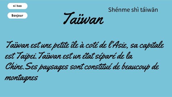 Taïwan est une petite île à coté de l'Asie, sa capitale est Taipei.Taïwan est un état séparé de la Chine.Ses paysages sont constitué de beaucoup de montagnes