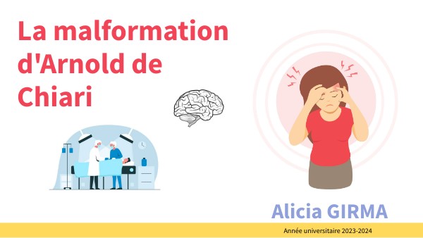 Il existe différentes pathologies atteignant le cerveau et ses alentours, causant de multiples problèmes. Dans cette présentation, nous allons découvrir la malformation d’Arnold de Chiari. Atteinte de cette pathologie à l’âge de mes 13 ans, je veux vous en apprendre plus sur cette maladie rare. Nous allons tout d’abord présenter la malformation d'Arnold de Chiari, ses origines, ses symptômes et enfin les solutions pouvant être apportées.