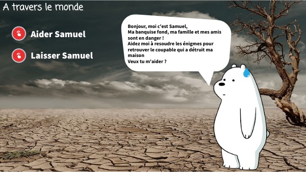 Bonjour, moi c'est Samuel, Ma banquise fond, ma famille et mes amis sont en danger ! Aidez moi à resoudre les énigmes pour retrouver le coupable qui a détruit ma maison Veux tu m'aider ?