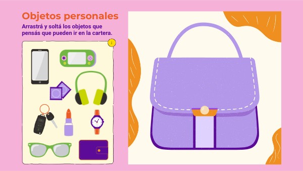 ¡Hola! Arrastra y suelta los objetos que pensás que pueden ir en la cartera.