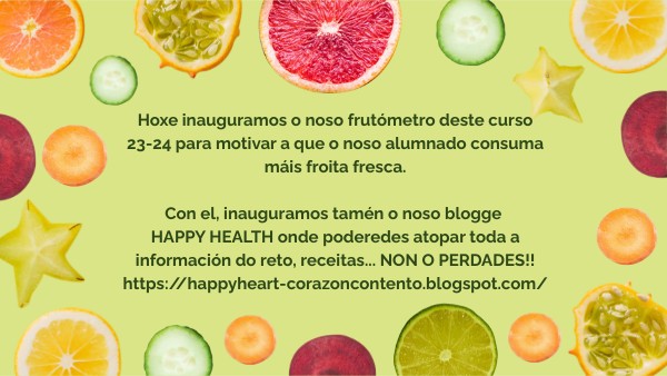 Hoxe inauguramos o noso frutómetro deste curso 23-24 para motivar a que o noso alumnado consuma máis froita fresca. Con el, inauguramos tamén o noso blogge HAPPY HEALTH onde poderedes atopar toda a información do reto, receitas... NON O PERDADES!! https://happyheart-corazoncontento.blogspot.com/