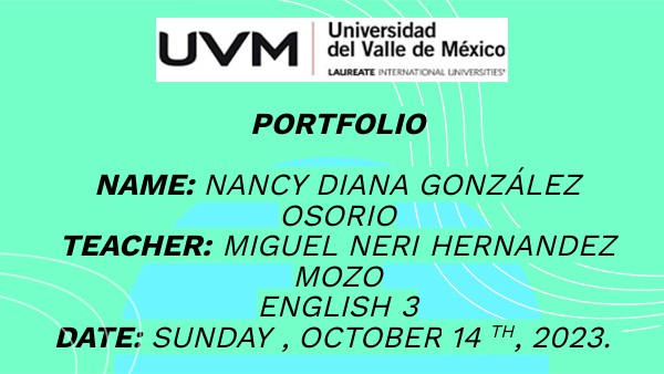 PORTFOLIO NAME: NANCY DIANA GONZÁLEZ OSORIO TEACHER: MIGUEL NERI HERNANDEZ MOZO ENGLISH 3 DATE: SUNDAY , OCTOBER 14 TH, 2023.