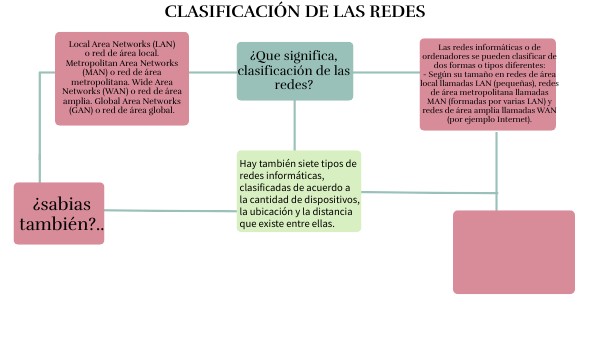 Local Area Networks (LAN) o red de área local. Metropolitan Area Networks (MAN) o red de área metropolitana. Wide Area Networks (WAN) o red de área amplia. Global Area Networks (GAN) o red de área global.