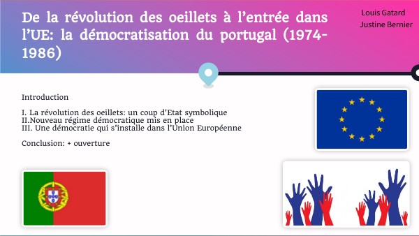 https://journals.openedition.org/ilcea/872https://www.universalis-edu.com/recherche/portugal%20Union%20Europ%C3%A9enne/article/1 https://www.herodote.net/28_mai_1926-evenement-19260528.php https://www.youtube.com/watch?v=_XPo4RlgOAk https://www.cairn.info/revue-recma-2016-4-page-86.htm https://www.universalis-edu.com/encyclopedie/union-europeenne-communaute-europeenne/ https://www.touteleurope.eu/pays/portugal/#:~:text=Le%20Portugal%20entre%20officiellement%20dans,et%20favorise%20son%20d%C3%A9veloppement%20%C3%A9conomique. https://www.lecese.fr/content/democratie-et-jeunes-ameliorer-la-representativite-intergenerationnelle https://www.defesa.gov.pt/pt/defesa/organizacao/comissoes/cphm/rphm/edicoes/ano1/n12021/bios/lidpolitica/aos https://lepetitjournal.com/lisbonne/25-avril-les-oeillets-ont-ils-toujours-le-parfum-de-la-revolution-255771 https://visao.pt/atualidade/politica/2021-07-25-otelo-saraiva-de-carvalho-auto-retrato-em-entrevista-com-o-25-de-abril-em-fundo/ https://umjeitomanso.blogspot.com/2014/04/otelo-saraiva-de-carvalho-e-salgueiro.html https://commons.wikimedia.org/wiki/File:Flag_CPLP.svg?uselang=fr