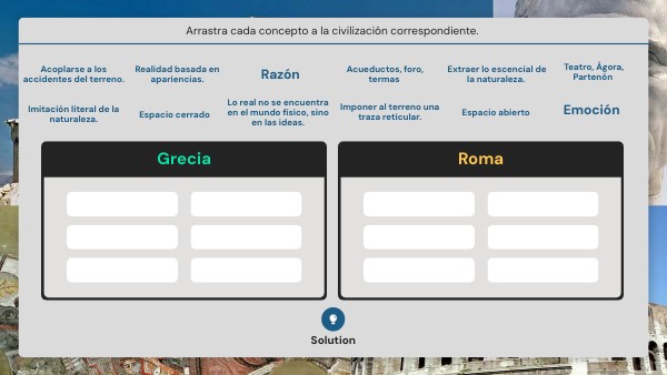 Imponer al terreno una traza reticular.; Imitación literal de la naturaleza.; Realidad basada en apariencias.; Emoción; Espacio cerrado; Acueductos, foro, termas